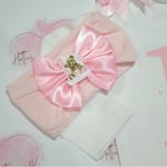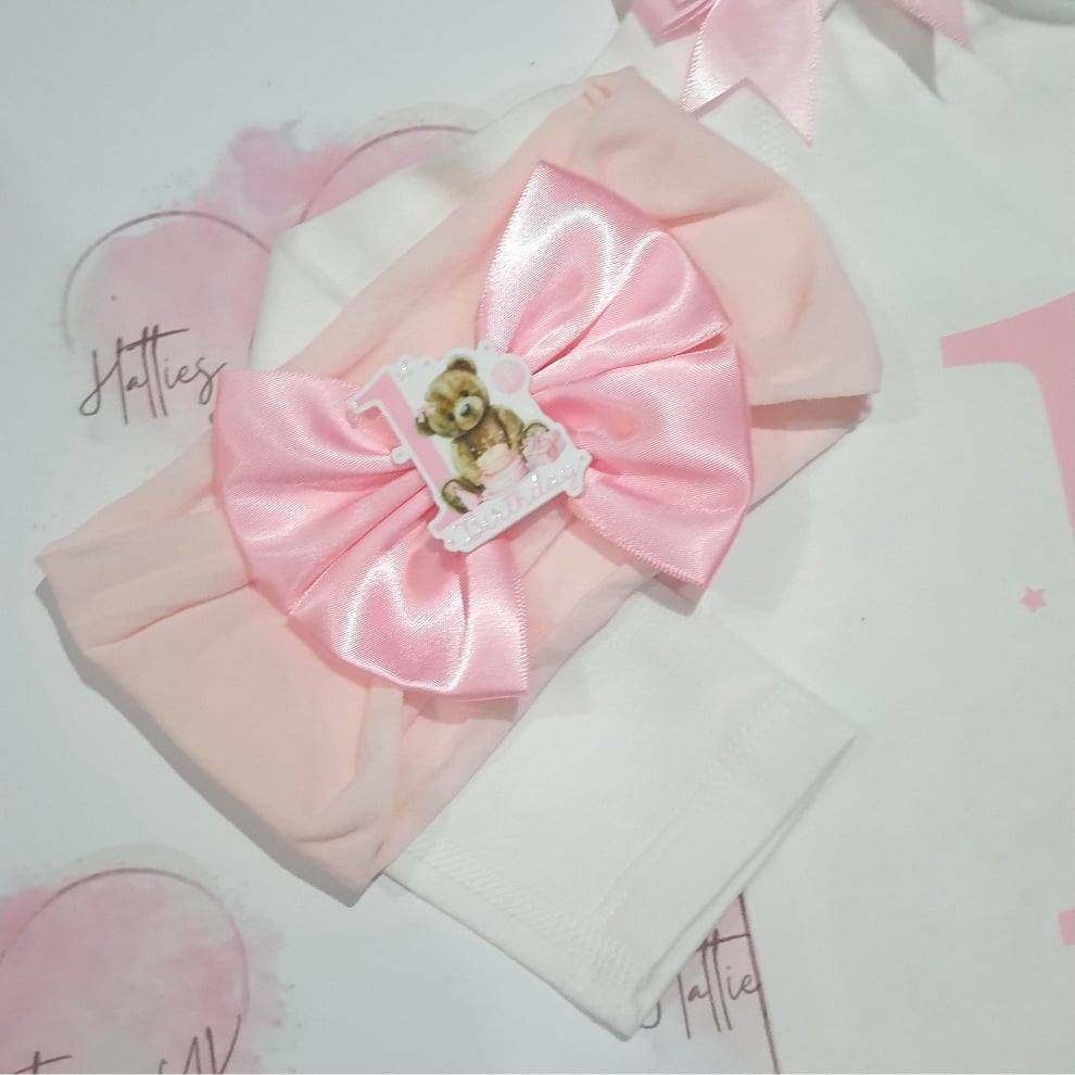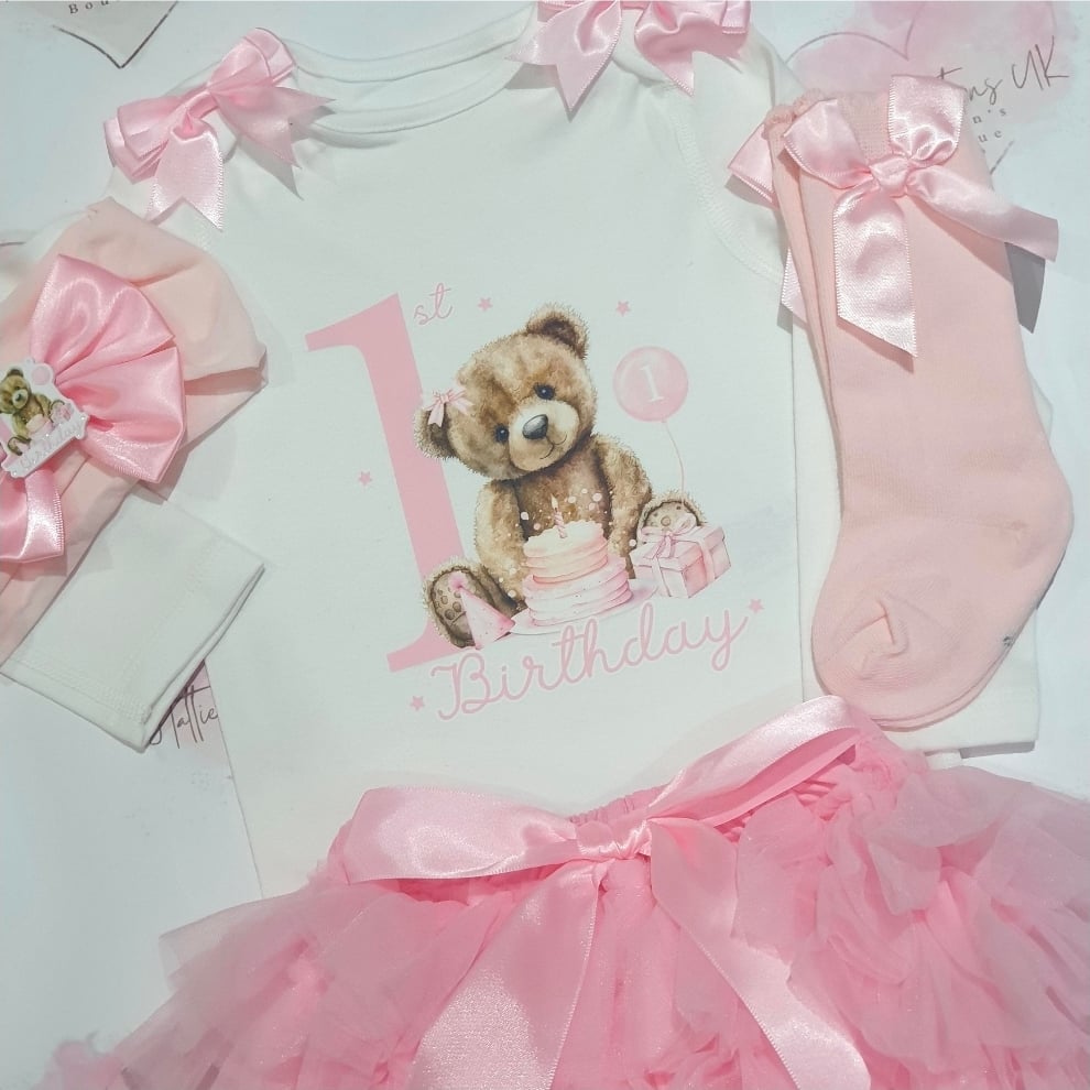 The set features a soft, fluffy baby pink tutu paired with a teddy-themed vest decorated with delicate bows. To complete the look, it also includes a matching headband and bow socks — giving you a fully coordinated birthday outfit with no extra shopping needed.