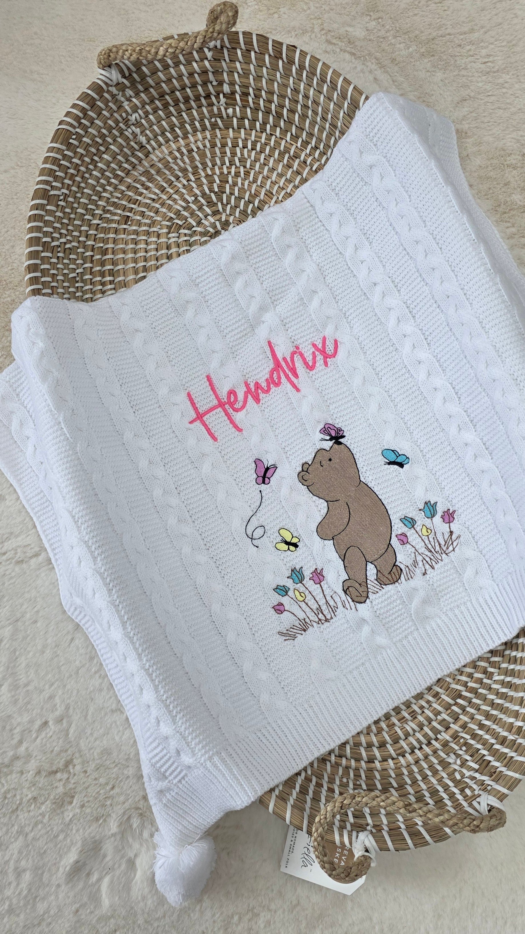 Wrap your little one in comfort with this beautiful personalised baby blanket. Featuring a sweet teddy bear surrounded by colourful butterflies and flowers, this soft knitted blanket is finished with your baby’s name embroidered in bright pink for a special personal touch.